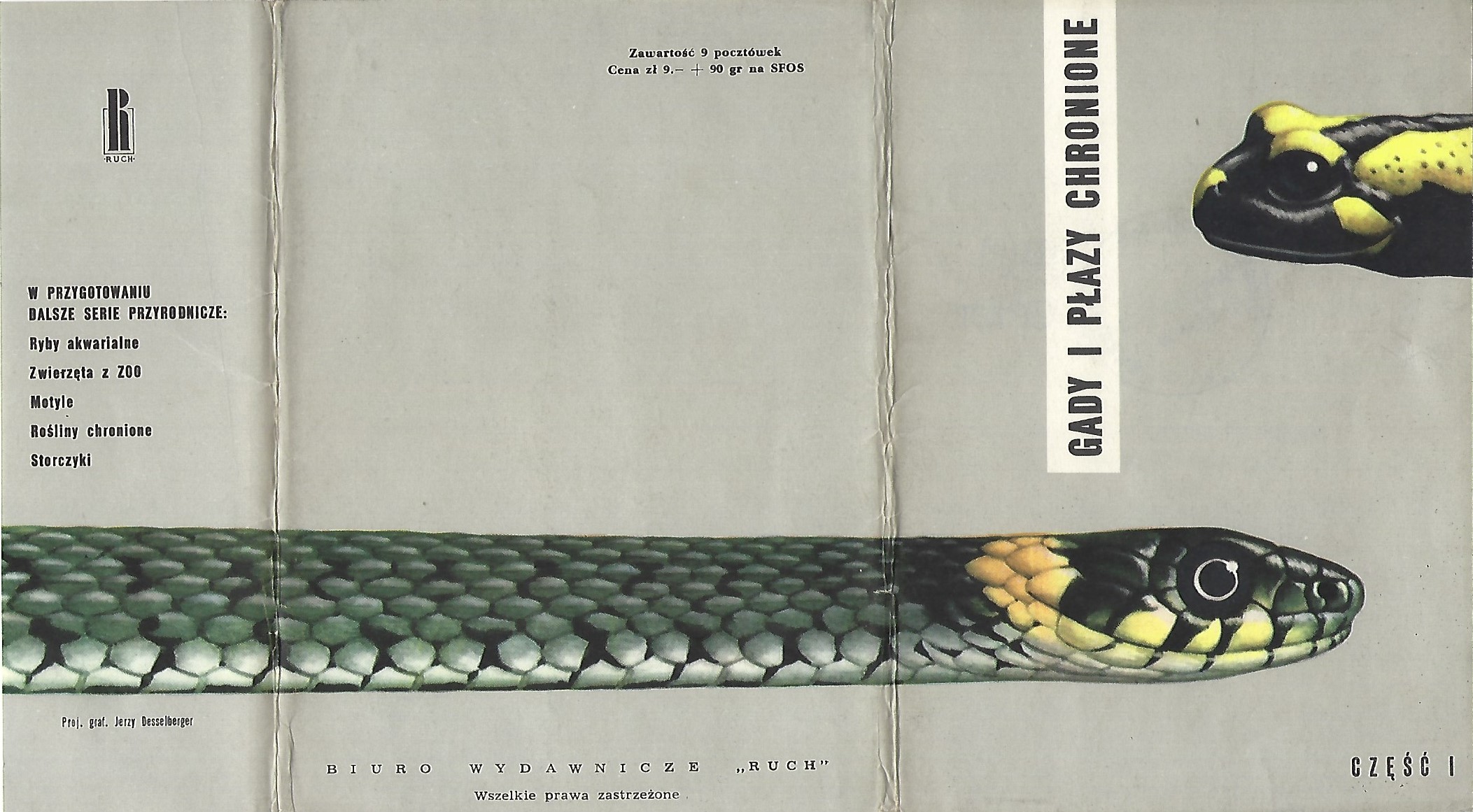 Ptaki wodne / proj. graf. Jerzy Desselberger. - Warszawa : Biuro Wydawnicze "Ruch", [1965]. - 1 teka (9 pocztówek) : kolor ; 15x11 cm.