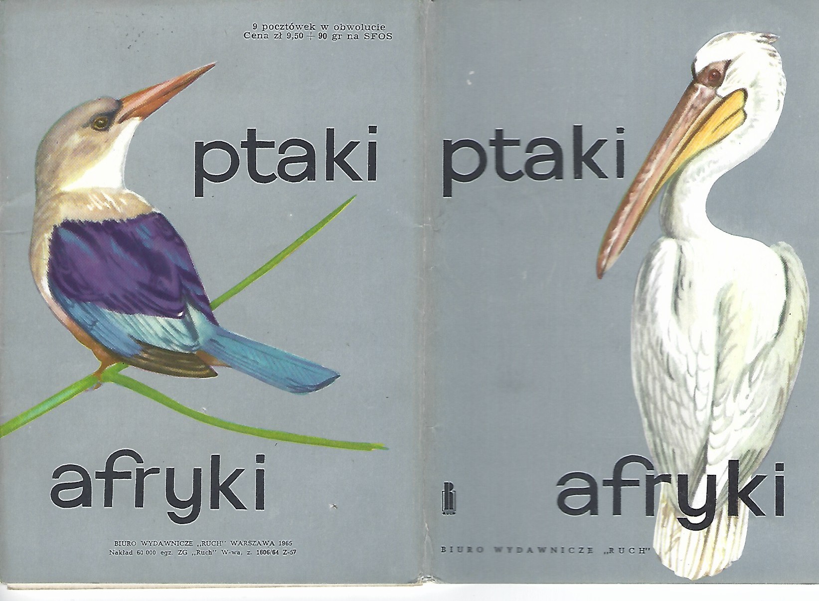 Ptaki Afryki / proj. graf. Alojzy Balcerzak. - Warszawa : Biuro Wydawnicze "Ruch", 1965. - 1 teka (9 pocztówek) : kolor ; 15x11 cm.